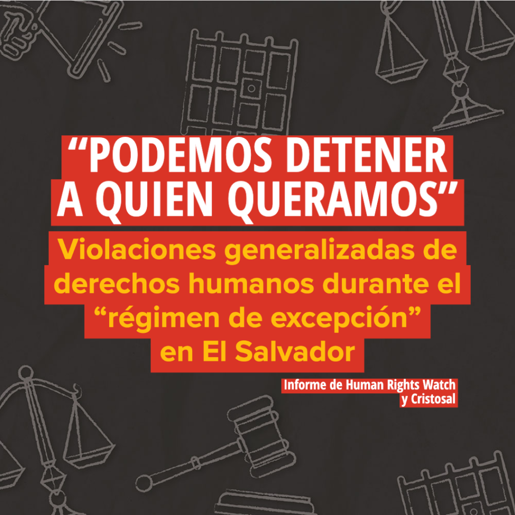 El presente informe, elaborado conjuntamente por Human Rights Watch y Cristosal, documenta violaciones generalizadas de derechos humanos cometidas durante el régimen de excepción, que la Asamblea prorrogó ocho veces y se encuentra vigente al momento de la redacción de este informe. Estos abusos incluyen detenciones arbitrarias, desapariciones forzadas, torturas y otros malos tratos en prisión, […]