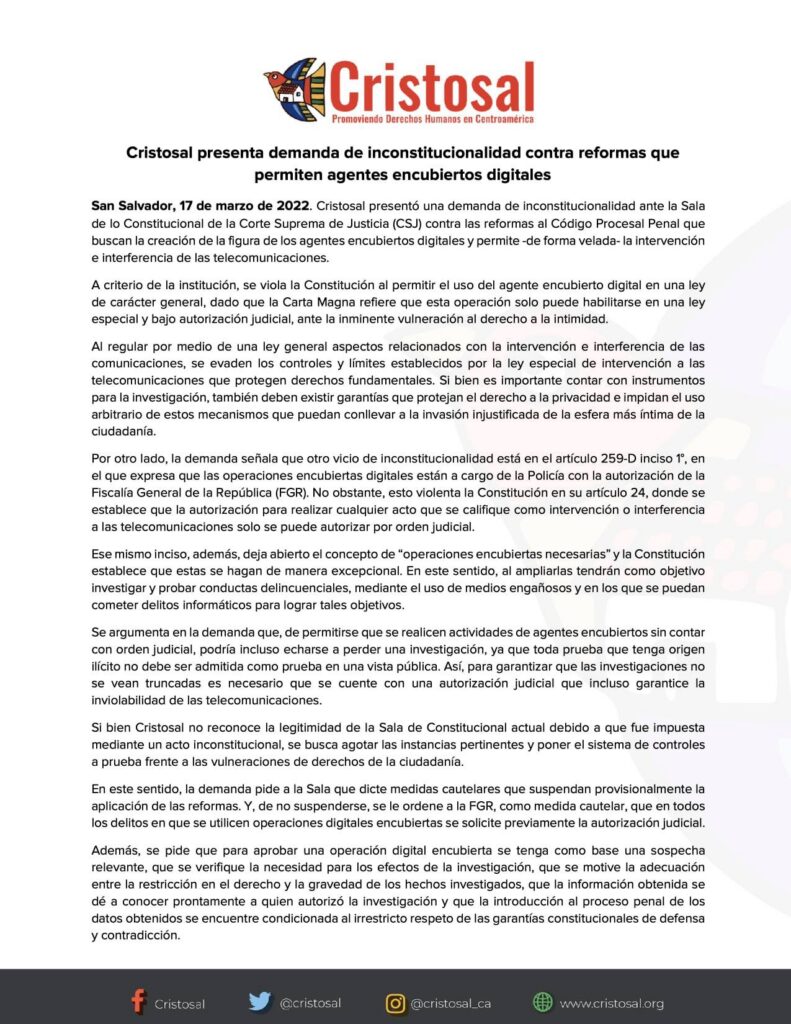 Cristosal presenta demanda de inconstitucionalidad contra reformas que permiten agentes encubiertos digitales