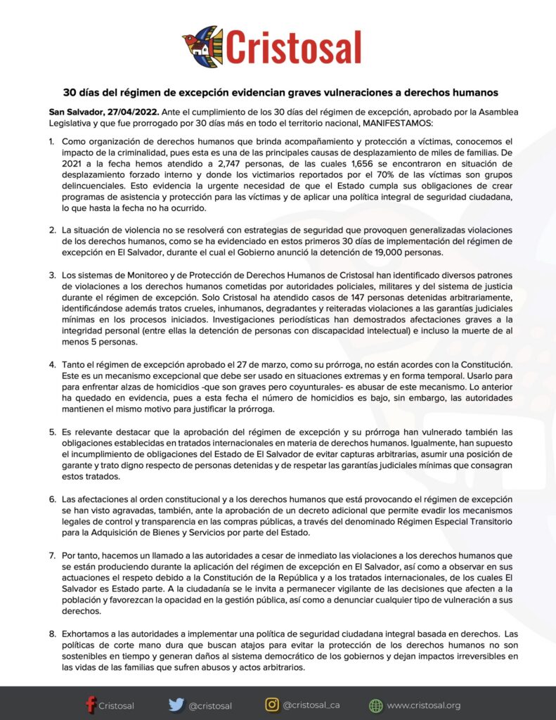 30 días del régimen de excepción evidencian graves vulneraciones a derechos humanos 27 de abril 2022