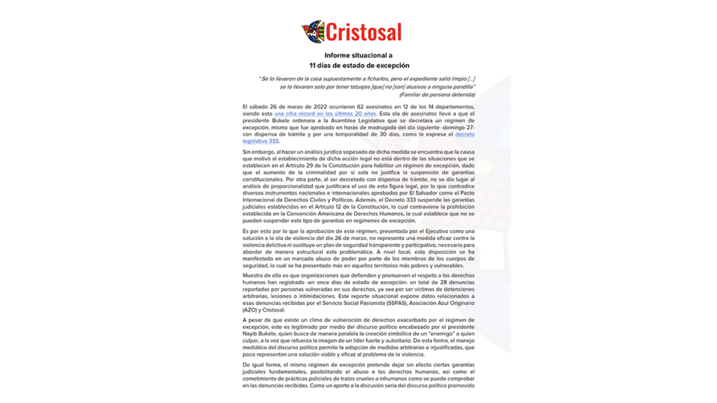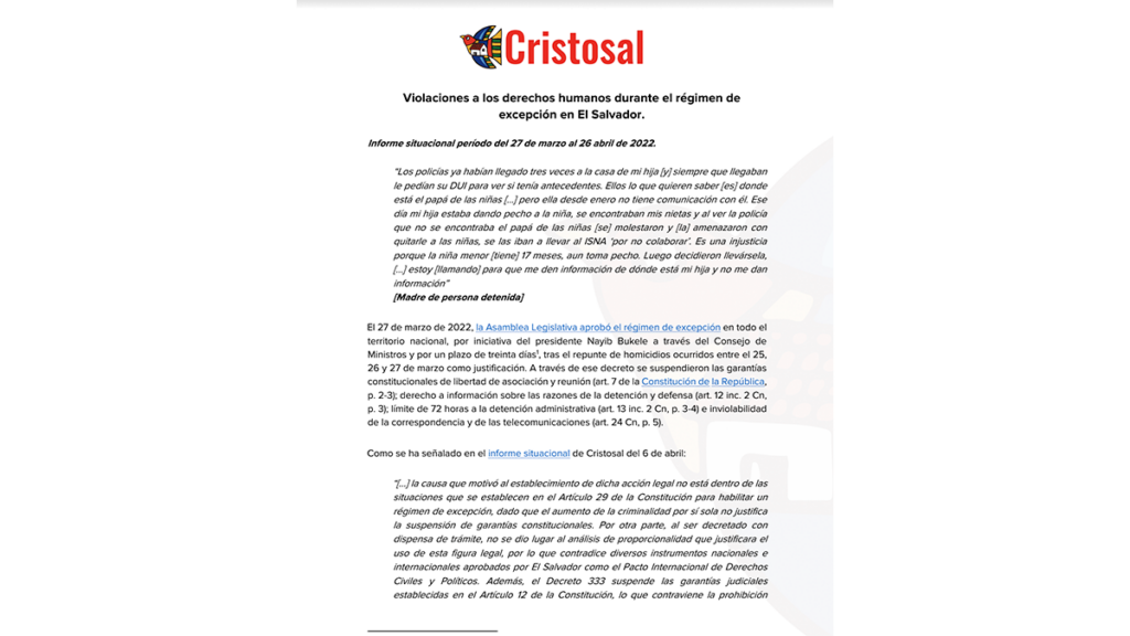 Cinco organizaciones sociales recibieron un total de 338 denuncias de violaciones derechos humanos en el primer mes de implementación del régimen de excepción en todo el territorio nacional. En su mayoría son casos de detenciones arbitrarias por parte de la Policía Nacional Civil (PNC). Descargar informe completo: