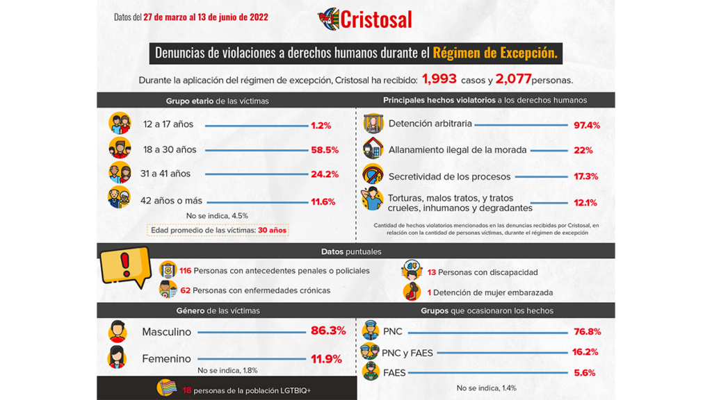 Desde el 27 de marzo al 13 de junio hemos recibido 1,993 casos de personas que han denunciado violaciones a derechos humanos durante el régimen de excepción.
