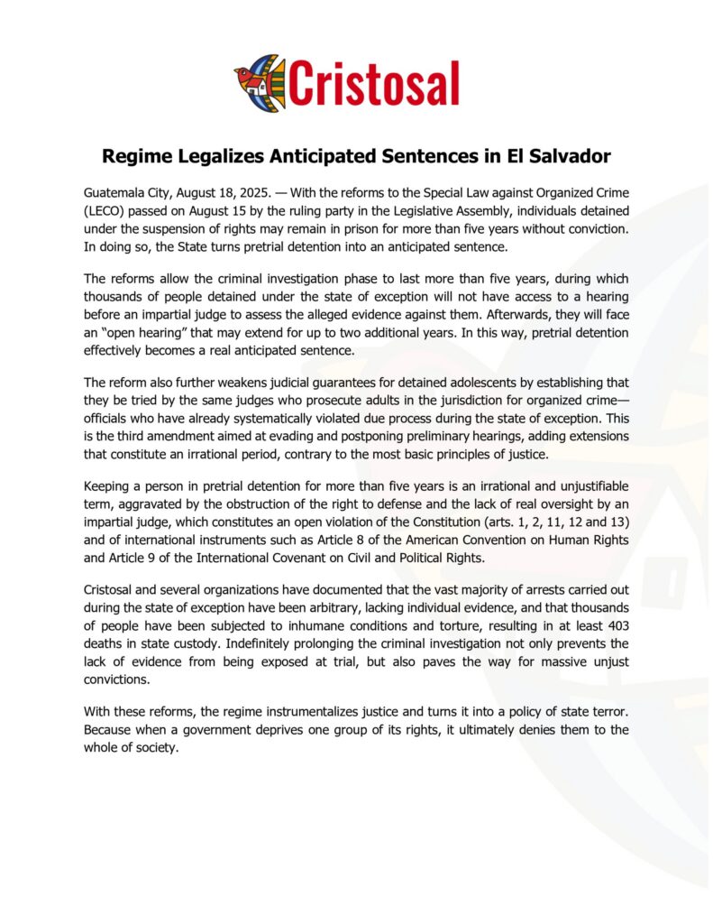 Cristosal celebra la liberación de las víctimas, pero exige que se rindan cuentas por las graves violaciones de los derechos humanos.