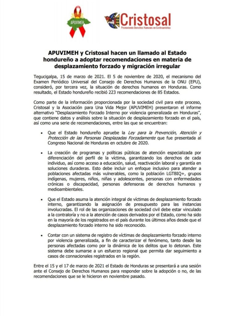 Llamado al Estado hondureño a adoptar recomendaciones en materia de desplazamiento forzado. 15 de marzo 2021