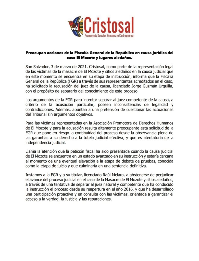 Preocupan acciones de la Fiscalía General de la República en causa jurídica del caso de El Mozote. 3 de marzo 2021